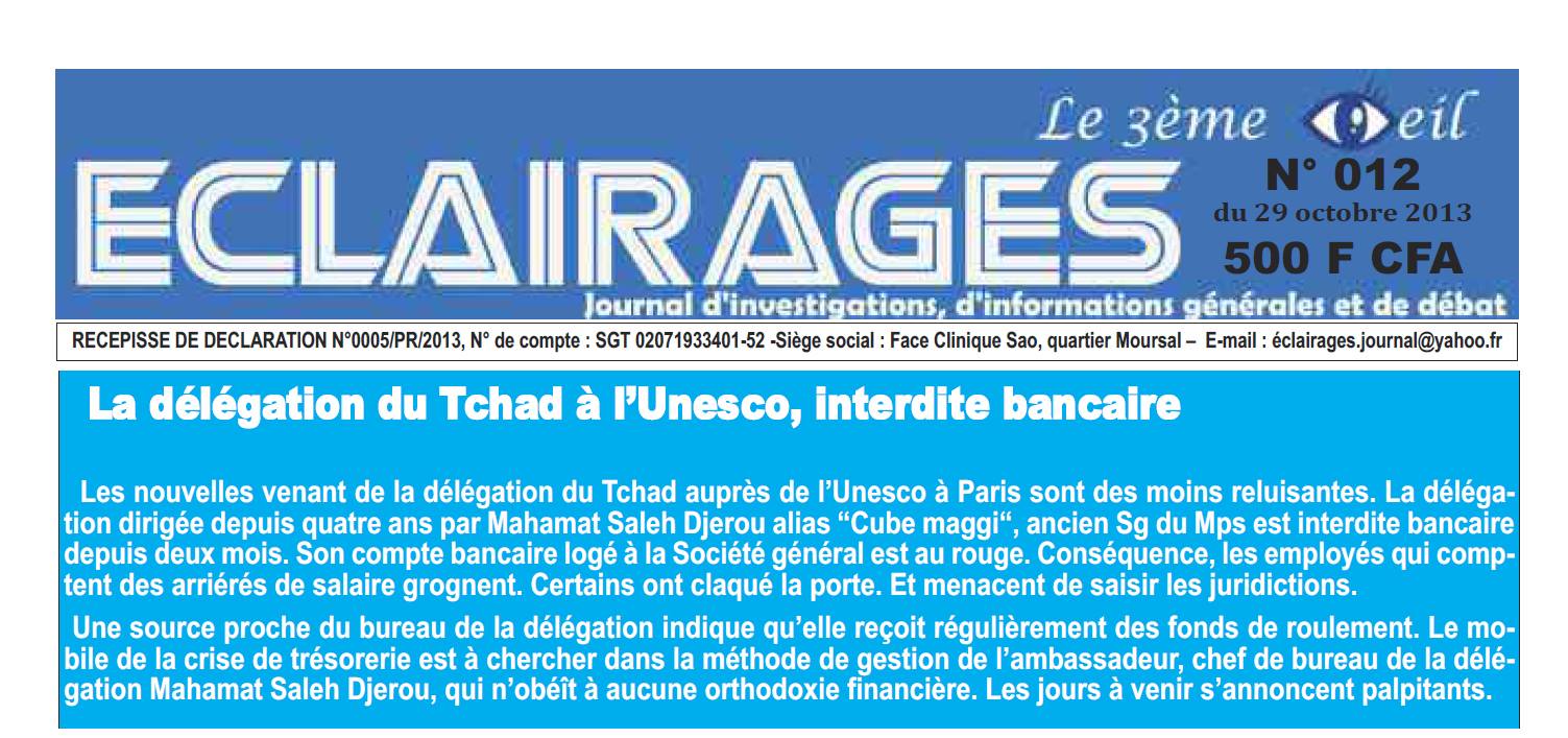 Incroyable, mais vrai ! Pendant que le Dr Mahamoud Adam Béchir, ambassadeur putatif du Tchad en Afrique du Sud, jette l’argent par la fenêtre (pour atterrir dans sa poche ?) en faisant l’acquisition d’une résidence à 4 milliards de nos francs, voilà qu’un autre ambassadeur, Mahamat Saleh Adoum Djerou, à la tête de notre représentation diplomatique à l’Unesco (Paris), a conduit son institution à la faillite. A telle enseigne que la représentation est désormais frappée d’interdiction bancaire, selon les révélations du bimensuel Eclairages.