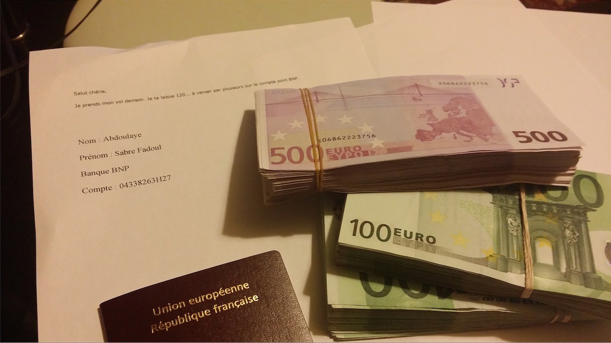 même scène photographiée sous deux angles différents avec une légère modification de la position des objets. La scène montre des billets de banque soigneusement empilés comme dans un film sur l’univers des narcotrafiquants : une grosse liasse de billets de 500 € et deux liasses moyennes de billets de 100 € ainsi qu’un passeport français, le tout posé sur une feuille ordinaire de format A4 sur laquelle on peut lire le message suivant : « Salut chérie, je prends mon vol demain. Je te laisse 120… à verser par plusieurs sur le compte joint BNP. Nom : Abdoulaye/ Prénom : Sabre Fadoul / Banque BNP / Compte : 04338263H27 ». Une scène de crime, donc.